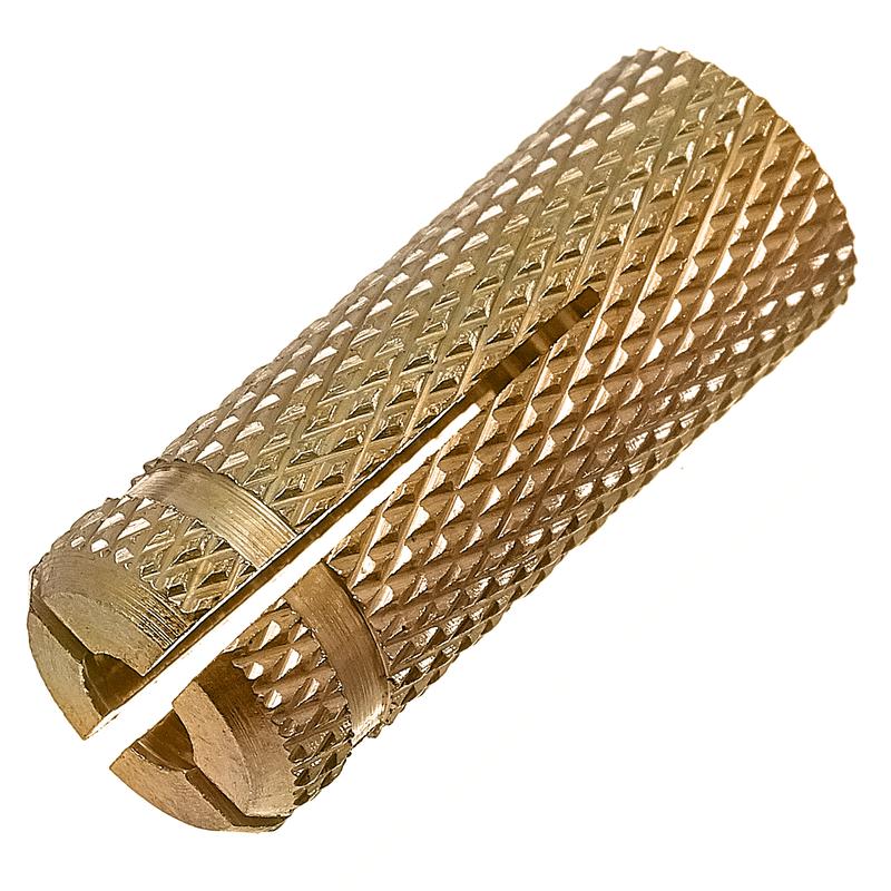 Несмотря на то, что латунь относится к цветным металлам, по цене это сравнительно недорогое изделие, так как размеры его малы. Забивной анкер представляет собой втулку, часть которой разрезана вдоль и образует лепестки. Также внутри, на внешнем крае, имеется резьба, на которую впоследствии можно будет накручивать метрический крепеж. Анкер забивают в отверстие в стене, и в результате механического воздействия металлические лепестки раскрываются, упираясь в стенки «гнезда».