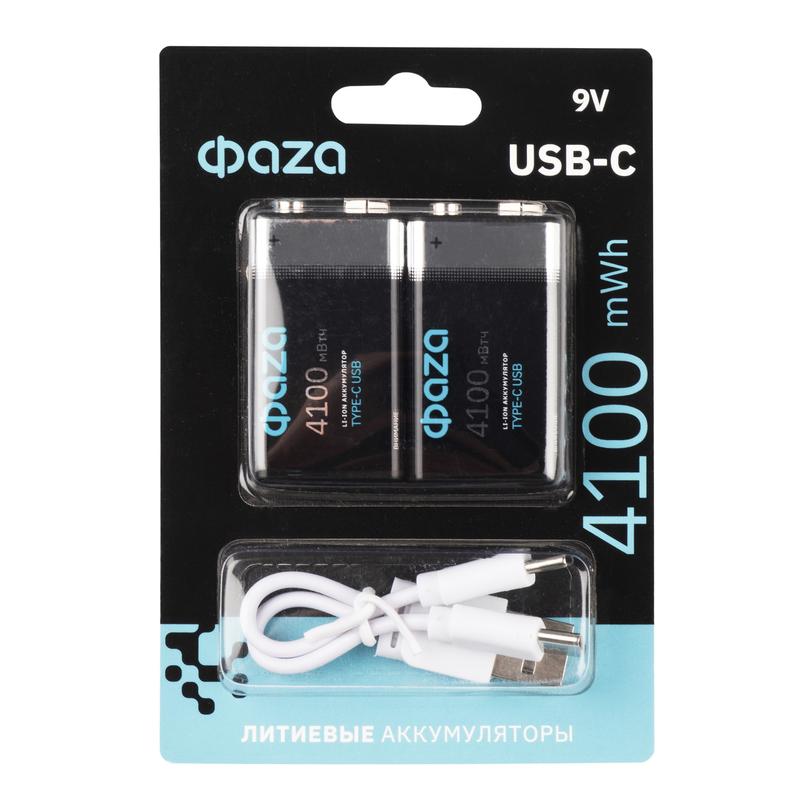 —Аккумулятор литиевый "крона" 9В Li-Ion 4100мВт.ч 455мА.ч зарядка от Type-C шнур в комплекте BL-2 (уп.2шт) ФАZА 5061699