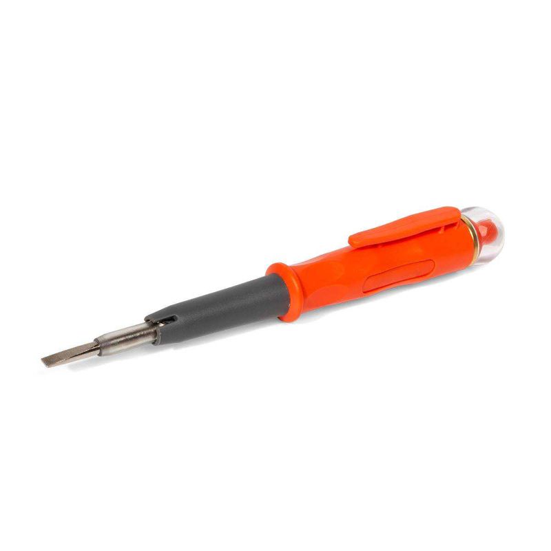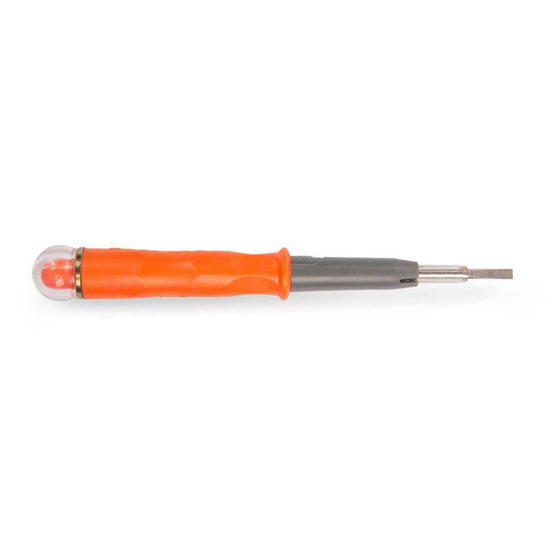 • Тестер для контактного или бесконтактного определения наличия переменного напряжения в диапазоне от 100 до 500 В • Защитный вращающийся колпачок на контактном электроде тестера • Бесконтактное определение напряжения возможно как при закрытом, так и при открытом электроде • Для увеличения чувствительности тестера прикоснитесь к металлическому кольцу • Клипса для крепления к карману • Индикаторная лампочка выполняет функцию подсветки • Прочный пластиковый корпус • Вес: 24 г • Длина: 153 мм