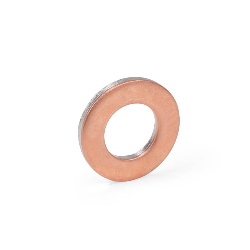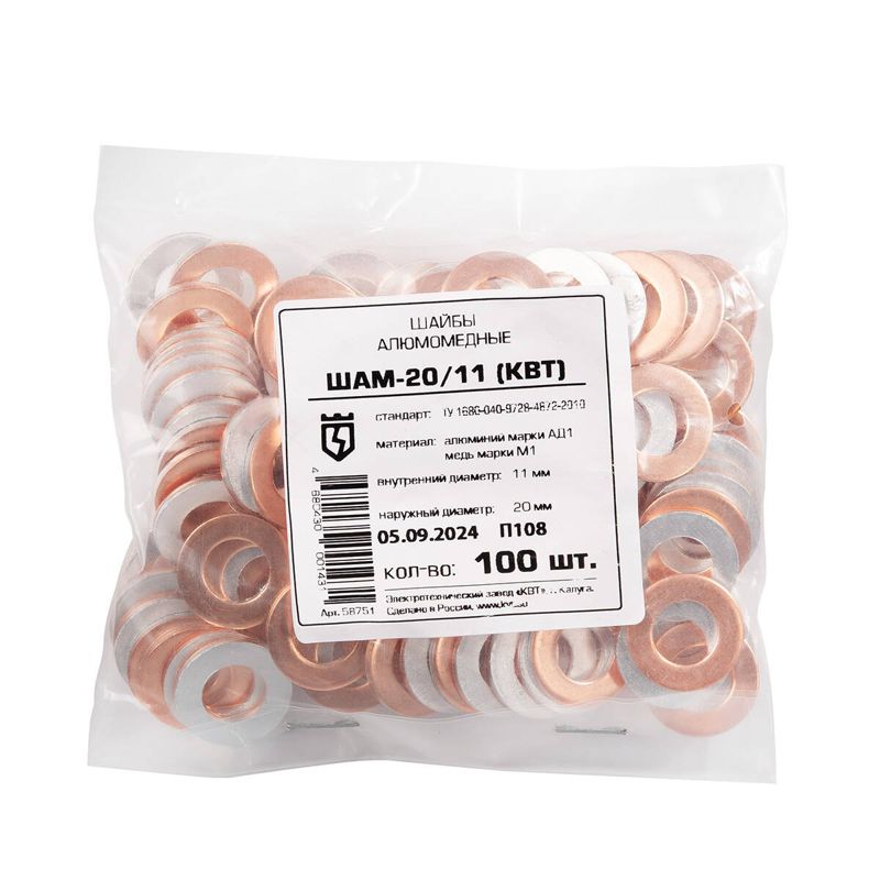 • Предназначены для подключения алюминиевых наконечников к медным шинам и клеммам электротехнических устройств • Материал: • электротехнический алюминий марки АД1 • медь марки М1 • Рабочее напряжение: до 1 кВ • Слои меди и алюминия соединены на молекулярном уровне, что исключает возникновение гальванической пары «медь – алюминий», приводящей к увеличению контактного сопротивления и аварийным ситуациям • Используется в качестве биметаллической прокладки между медной шиной и контактной лопаткой алюминиевого наконечника • При установке шайбы ее медная сторона монтируется к медной шине, а алюминиевая — к алюминиевому наконечнику • Алюмомедные шайбы являются универсальными и подходят для нескольких размеров алюминиевых наконечников с одинаковым отверстием под контактный винт • Экономная альтернатива алюмомедным наконечникам • Рекомендованы для оснащения ремонтных бригад и аварийных служб